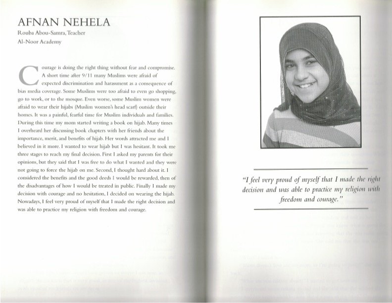 Courage is doing the right thing without fear and compromise. A short time after 9/11 many Muslims were afraid of expected discrimination and harassment as a consequence of bias media coverage. Some Muslims were too afraid to even go shopping, go to work, or to the mosque. Even worse, some Muslim, women were afraid to wear their hijabs (Muslim women’s head scarf) outside their homes. It was a painful, fearful time for Muslim individuals and families. During this time my mom started writing a book on hijab. Many times l overheard her discussing book chapters with her friends about the importance, merit, and benefits of hijab. Her words attracted me and I believed in it more. I wanted to wear hijab but I was hesitant. It took me three stages to reach my final decision. First I asked my parents for their opinions, but they said that I was free to do what I wanted and they were not going to force the hijab on me. Second, I thought hard about it. I considered the benefits and the good deeds I would be rewarded, then of the disadvantages of how I would be treated in public. Finally I made my decision with courage and no hesitation, I decided on wearing the hijab. Nowadays, I feel very proud of myself that I made the right decision and was able to practice my religion with freedom and courage.