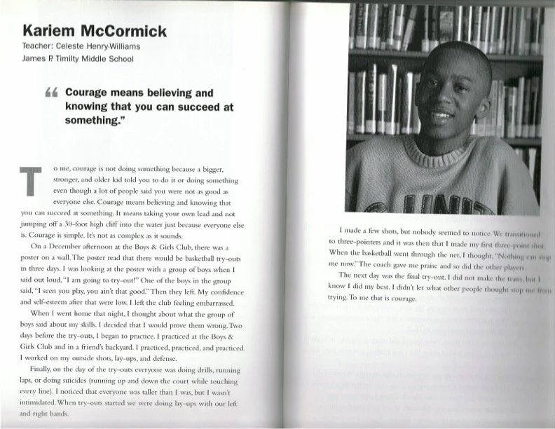 Kariem wrote his MAXCourage award-winning essay “in a subject [he] was not particularly fond of — ELA,” on trying out for the basketball team. Even though he did not make the team, he believes he found courage in being able to try, and to try again. (He persevered and made the team in other years — a happy ending not seen in our 2005 book!) Receiving the award was tremendous for his confidence: He received other academic achievement awards as president of his debate team in high school, and later had his original music featured in a national hip-hop magazine. Today, he works for Boston Public Schools as a retention fellow.