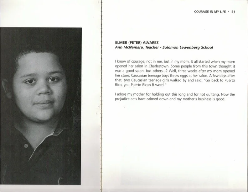 I know of courage, not in me, but in my mom. It all started when my mom opened her salon in Charlestown. Some people from this town thought it was a good salon, but others...? Well, three weeks after my mom opened her store, Caucasian teenage boys threw eggs at her salon. A few days after that, two Caucasian teenage girls walked by and said, “Go back to Puerto Rico, you Puerto Rican B word.”