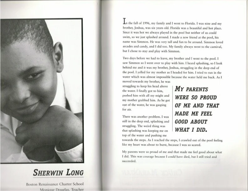 In 2000, Sherwin penned an award-winning essay recounting his heroic act of saving his brother from drowning. His remarkable story was later showcased in a book written by T. A. Barron titled The Hero's Trail: A Guide for a Heroic Life, which celebrated the extraordinary achievements of children.